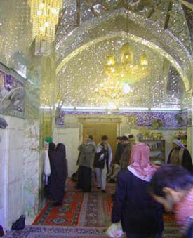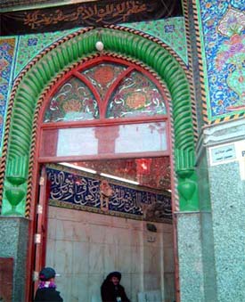 وكما تقدم الحديث يقع على التل المعروف لذلك فإن طبيعة استلزمت وجود سلم صغير كُسي بالمرمر موصل ما بين الصحن والمقام الذي تعلوه طارمة أمامية مرتكزة على دعامتين ومن ثم يتم الدخول إلى المقام الشريف عبر باب صنع من خشب الصاج بعرض مترين وارتفاع أربعة أمتار زين بالآية القرآنية الشريفة : «إِنَّمَا يُرِيدُ اللَّهُ لِيُذْهِبَ عَنكُمُ الرِّجْسَ أَهْلَ الْبَيْتِ وَيُطَهِّرَكُمْ تَطْهِيراً» الأحزاب:33