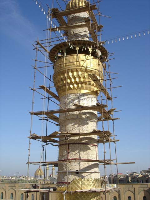 في سنة 1356هـ (1937م) مالت إحدى المئذنتين الموجودتين في مقدمة الحرم الحسيني واللتين شيدتا في عهد السلطان أويس الجلائري هي المئذنة الغربية. فأمر السلطان طاهر سيف الدين الإسماعيلي بهدمها وتشييد مئذنة أخرى محلها من الطابوق (الآجر) والجص ، أما المئذنة الشرقية فبقيت على حالها حتى يومنا هذا.