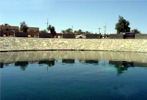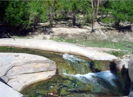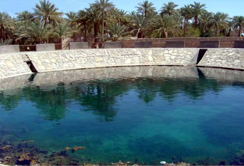 هناك تدخل مباشرة إلى غابة من النخيل قاطعا قناطر صغيرة ترتفع فوق مياه صافية يجري ماؤها رقراقاً . هناك وسط غابات النخيل تواجدت العيون المشهورة . . عيون كبريتية لا يتوقف الماء فيها ، تسقي شلالات النخيل والبساتين عبر سواق وانهار صغيرة وجداول جعلت من الحب آصرة لها لتغدق على الأرض بعضا من حب الله لهذه الأرض . .فتكون سرا من أسرار الصحراء فتحولت إلى مركز تجاري للبدو بعد أن كانت مركزا تجاريا لتجارة القوافل في عهد ما من عهود التاريخ ..